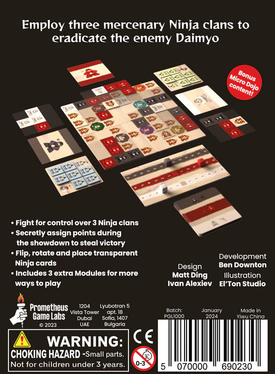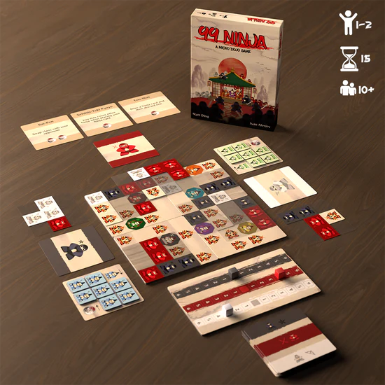 99 Ninja is a two player competitive tile laying game, where players use transparent cards depicting ninja from 3 different clans to surround (and assassinate) daimyo. Like other games from Prometheus Game Labs there is a lot of tactical play – you will have to time your placement and outmaneuver, but also out think, your opponent! And yes, there are 99 ninja on the cards. We counted.