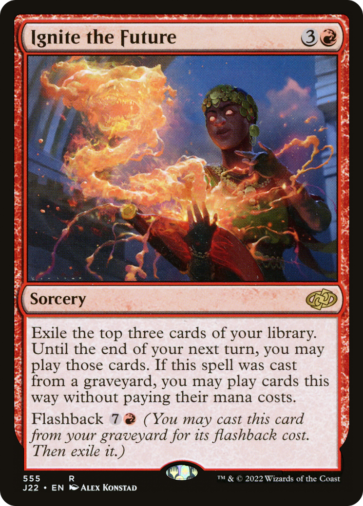 Exile the top three cards of your library. Until the end of your next turn, you may play those cards. If this spell was cast from a graveyard, you may play cards this way without paying their mana costs.