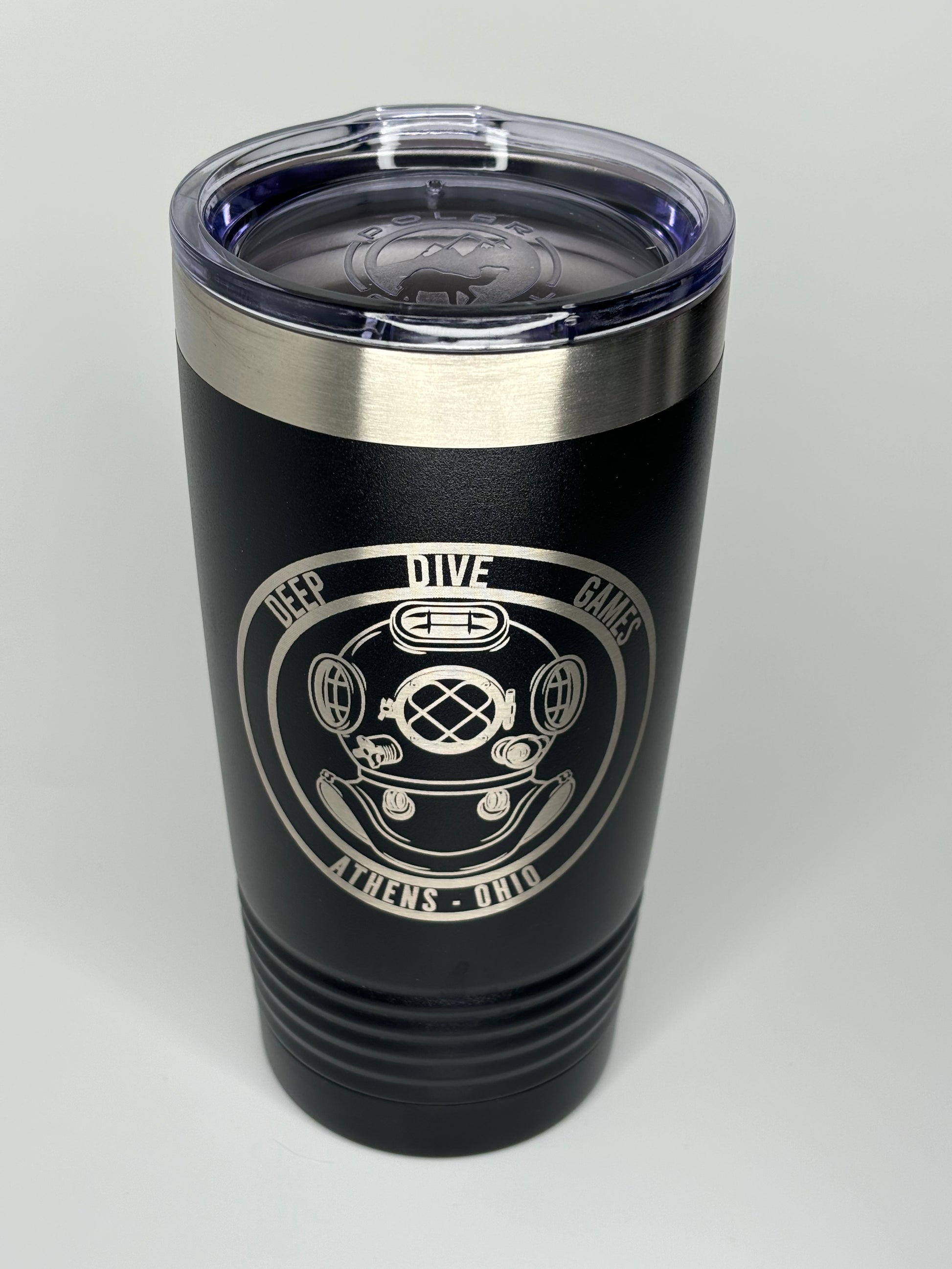 Polar Camel Brand 20 oz Tumbler. Black in color. Deep Dive Games Logo laser engraved.