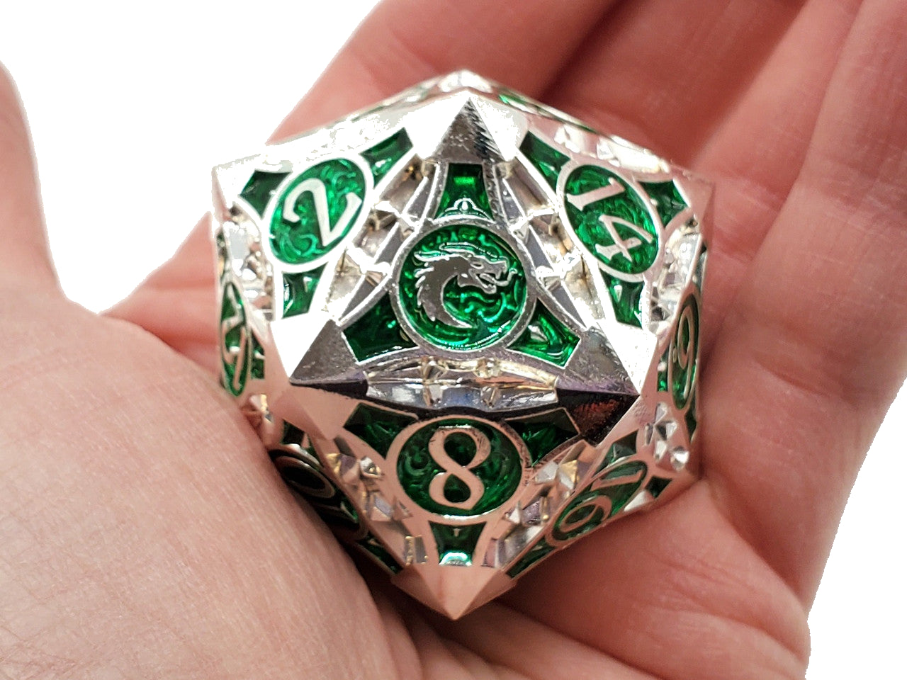 Old School 40mm D20 Metal Die: Gnome Forged - Silver w/ Green