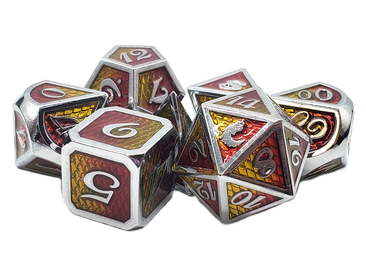 Old School 7 Piece DnD RPG Metal Dice Set: Dragon Scale - Yellow & Red