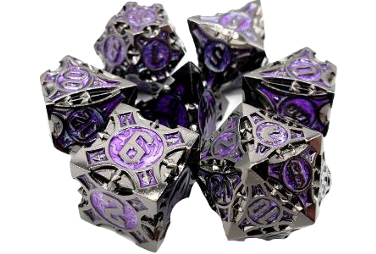Old School 7 Piece DnD RPG Metal Dice Set: Gnome Forged - Black Nickel w/ Purple