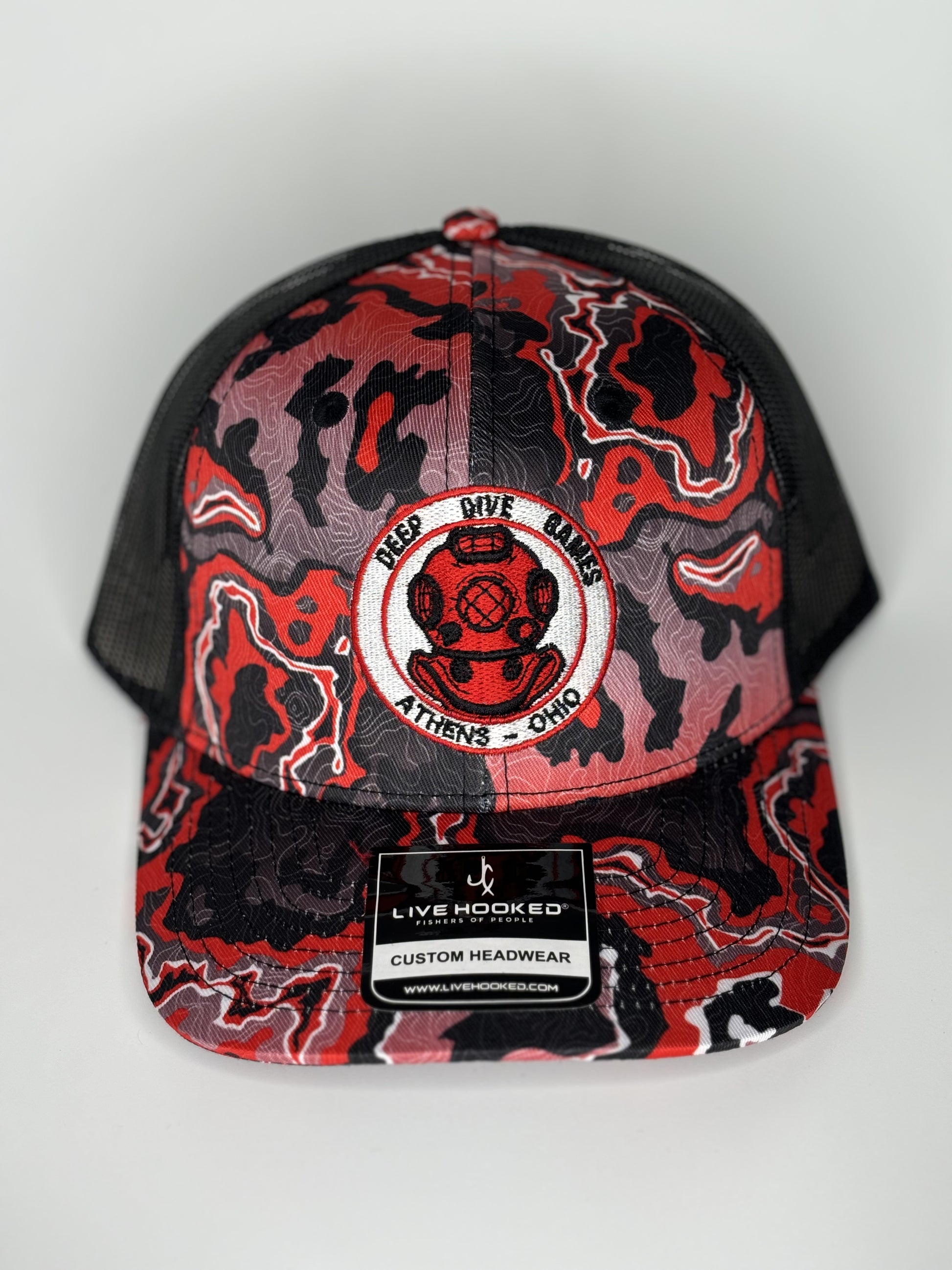 Living Hooked Snapback Trucker Hat. Red and Black Wave Design with Deep Dive Games Athens logo Embroidery.