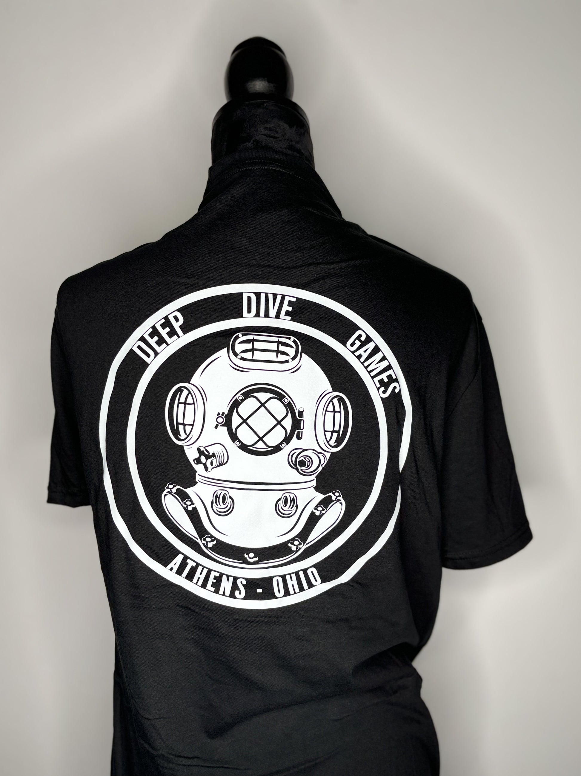District DM108 Perfect Blend Tee-Shirt with Deep Dive Games Lettering on left front breast and Deep Dive Games Athens Logo printed on whole back.