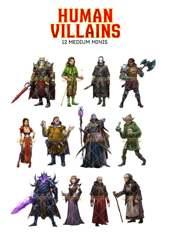 Human Villains - 12 Medium Minis- Brute, Con Man, Corrupt Merchant, Death Knight, Evil Grandmother, Evil King, Evil Priest, Evil Queen, Evil Wizard, Mad Scientist, Seductress, Serial Killer