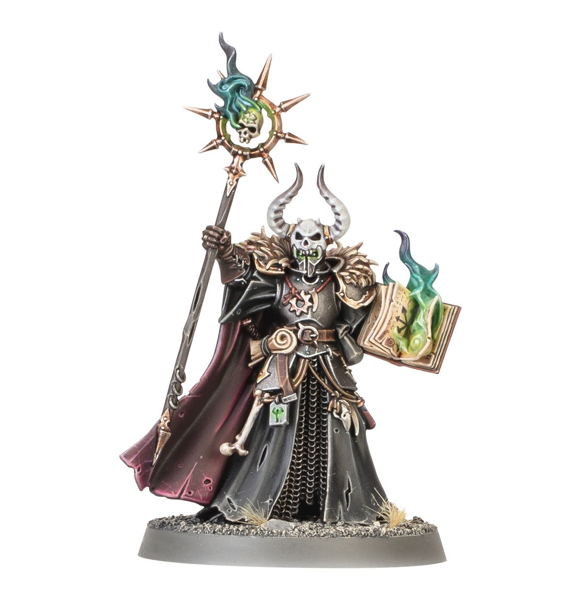 Armed with a sorcerer staff and runeblade, Tzarketh is clad in armour and furs that are scattered with talismans and trinkets that distinguish him as a shaman. He also carries a baleful tome filled with cursed words from which flames billow.